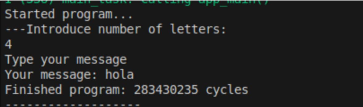 .data space: .zero 100 #Buffer to place the string initial: .string "Introduce number of letters:\n" aux: .string "%d\nType your message\n" print: .string "Your message: %s\n"Serial: Start terminal output and input. On most boards, such as Arduino and Espressif, in order to use the terminal, it needs to be initialized with a specific frequency. In this case, we will use the