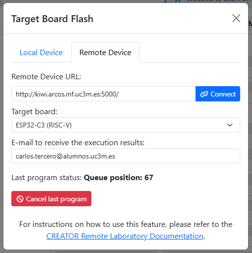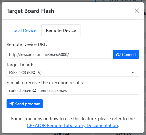 CREATOR's Remote Laboratory allows students to execute their programs in remote ESP32 hardware provided by their teachers.